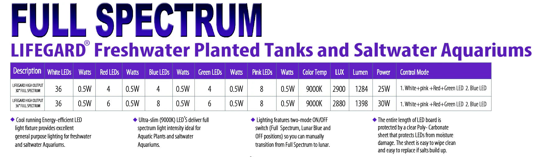Featuring 9000K full spectrum LEDs, this fixture provides the ideal light intensity for vibrant aquatic life. A convenient two-mode ON/OFF switch lets you transition between Full Spectrum daytime lighting and Lunar Blue nighttime lighting.